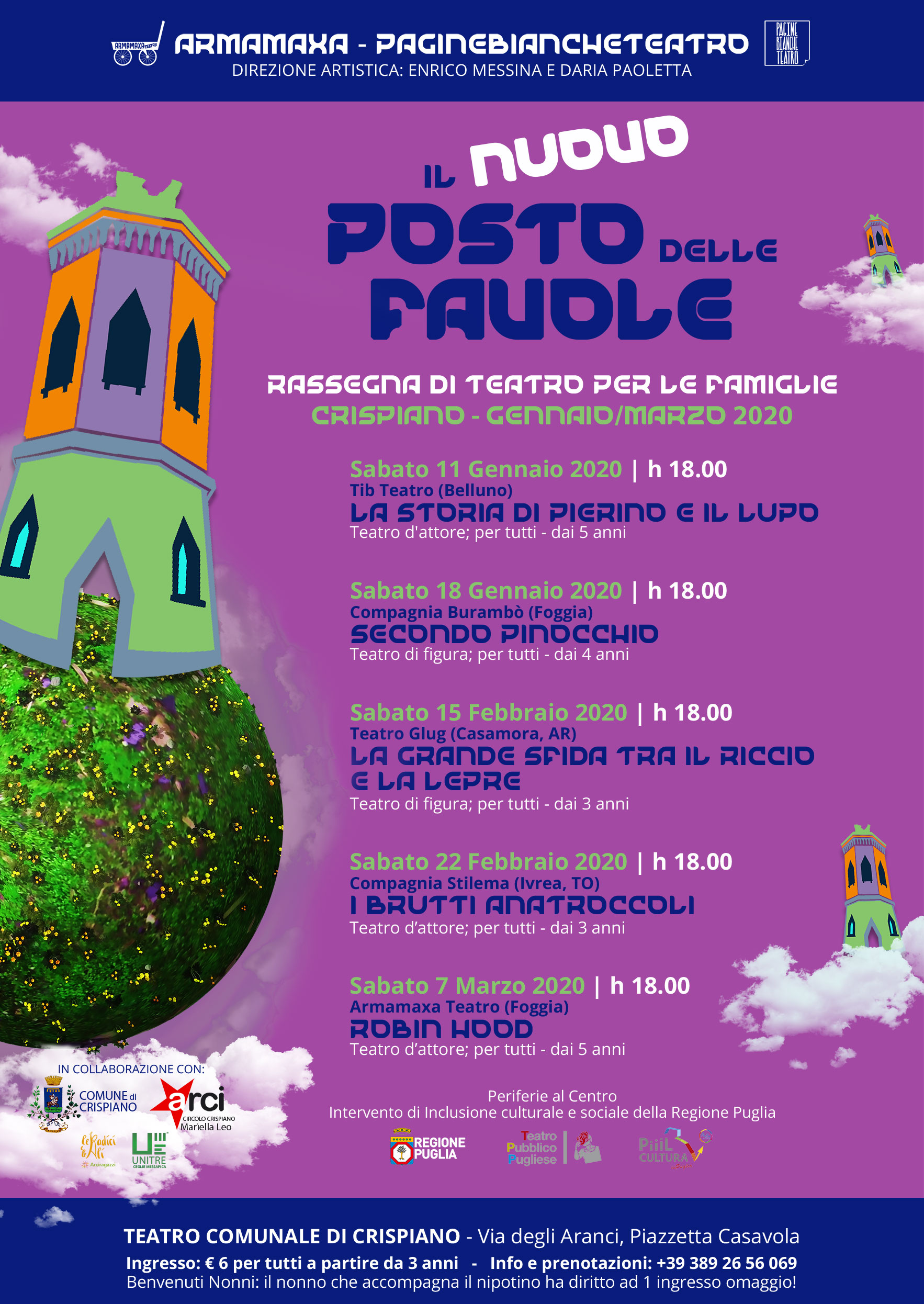 Il progetto avrà come “fulcro” il Comune di Crispiano e, dopo l’apertura di sabato 11 gennaio 2020, si svilupperà da gennaio a giugno 2020 lungo due assi principali: da un lato con l’organizzazione di una rassegna di spettacoli teatrali tout-publique, presso il Teatro Comunale di Crispiano, che soddisferà la grande richiesta di offerta culturale di qualità espressamente rivolta ai bambini e alle famiglie; dall’altro con azioni di formazione del pubblico con eventi speciali e laboratori teatrali e di promozione della lettura rivolti a tutte le fasce di età (che si svolgeranno a Ceglie Messapica, Francavilla Fontana e Crispiano) e che forniranno nuova linfa ed energia alle attività che da anni i