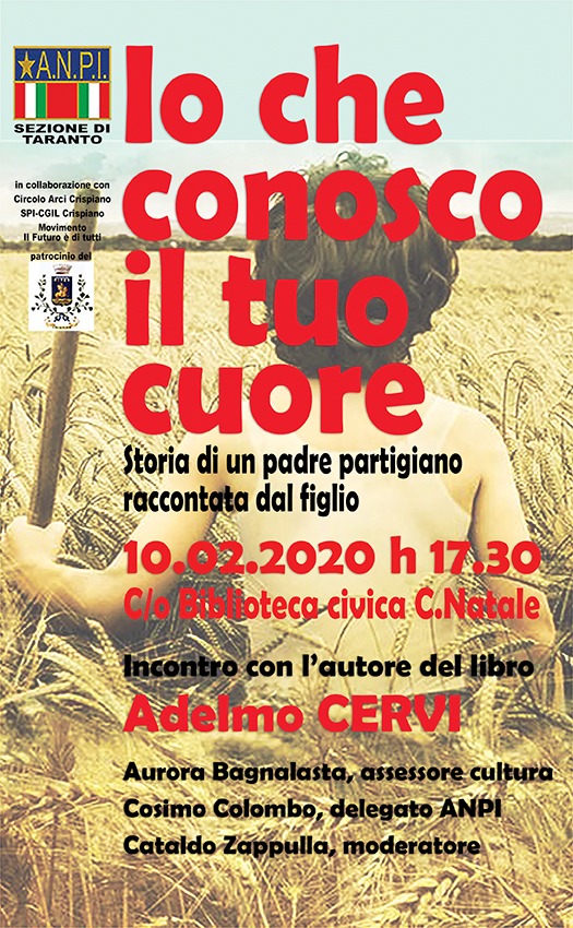 A “ 75 anni dalla Liberazione, lunedi 10 febbraio 2020 alle ore 17.30 la Biblioteca Comunale “C. Natale” di Crispiano ospita la presentazione del libro ‘Io che conosco il tuo cuore’ alla presenza dell’autore Adelmo Cervi.