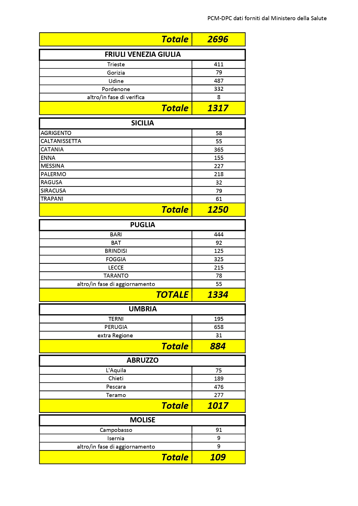 Il totale dei casi positivi Covid in Puglia è di 1.334, così divisi: