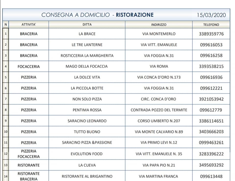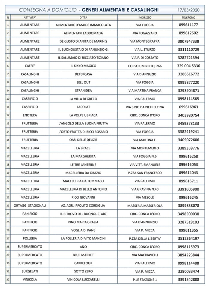 AGGIORNAMENTO ESERCIZI COMMERCIALI DI GENERI ALIMENTARI, CASALINGHI E DI RISTORAZIONE CHE OFFRONO LA CONSEGNA A DOMICILIO 17 Marzo 202017 Marzo 2020Coronavirus