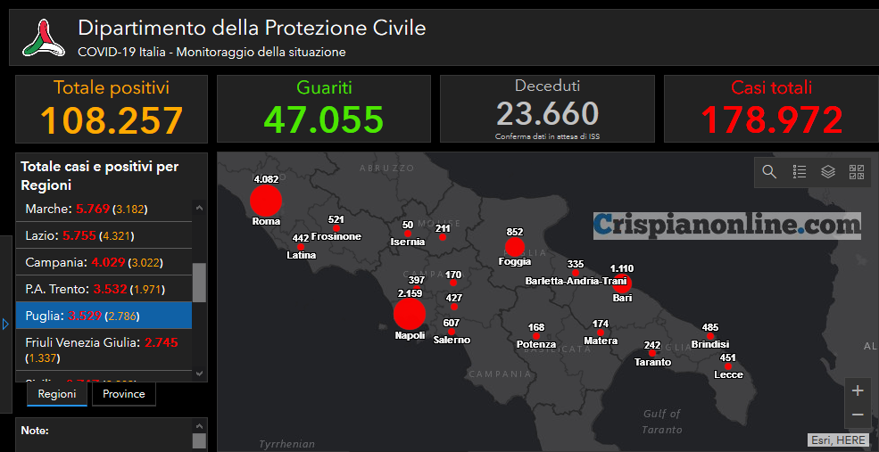 Il totale dei casi positivi Covid in Puglia è di 3.529 così divisi:
