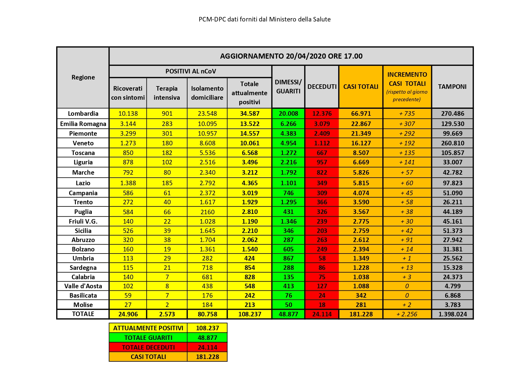 ll presidente della Regione Puglia, Michele Emiliano, sulla base delle informazioni del direttore del dipartimento Promozione della Salute Vito Montanaro, informa che oggi lunedì 20 aprile, in Puglia, sono stati registrati 1.591 test per l’infezione da Covid-19 coronavirus e sono risultati positivi 38 casi, così suddivisi: