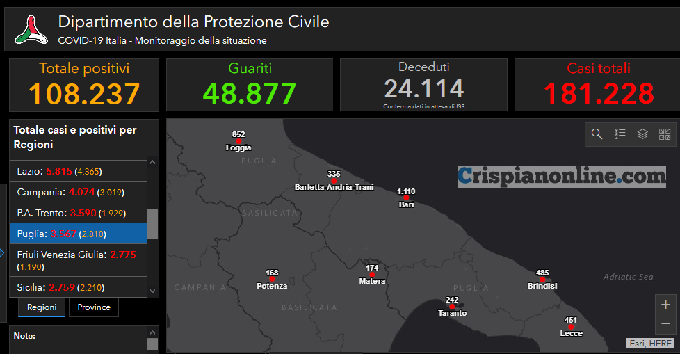 Il totale dei casi positivi Covid in Puglia è di 3.567 così divisi:
