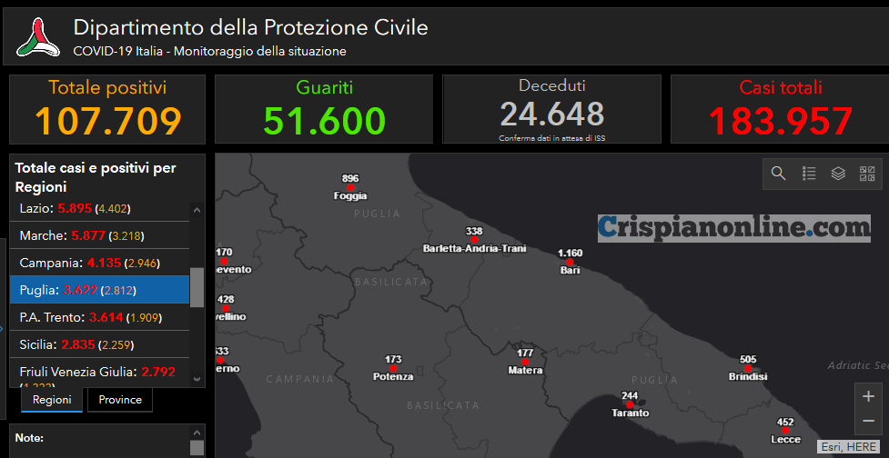 Il totale dei casi positivi Covid in Puglia è di 3.622 così divisi: