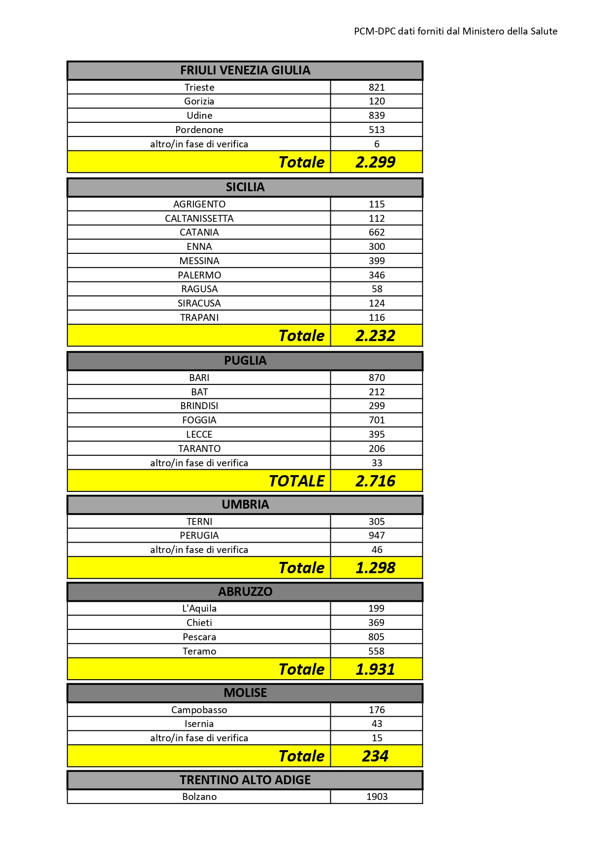 Il totale dei casi positivi Covid in Puglia è di 2.716 così divisi: