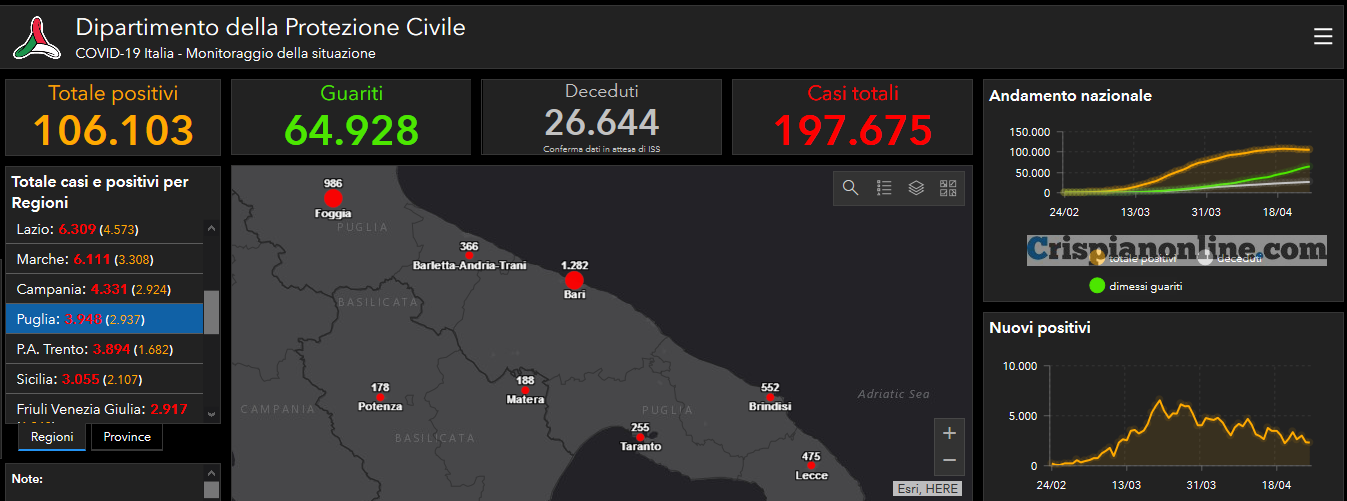 Il presidente della Regione Puglia, Michele Emiliano, sulla base delle informazioni del direttore del dipartimento Promozione della Salute Vito Montanaro, informa che oggi domenica 26 aprile, in Puglia, sono stati registrati 1294 test per l’infezione Covid-19 coronavirus e sono risultati positivi 36 casi, così suddivisi:
