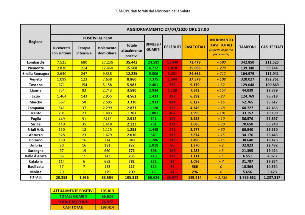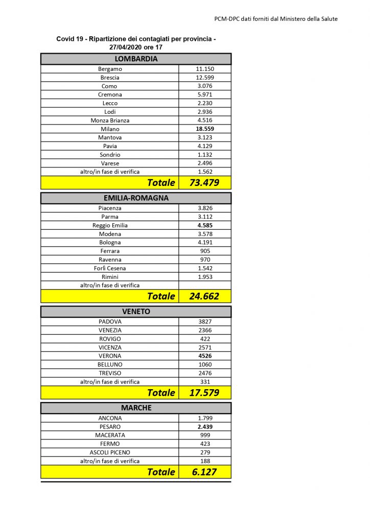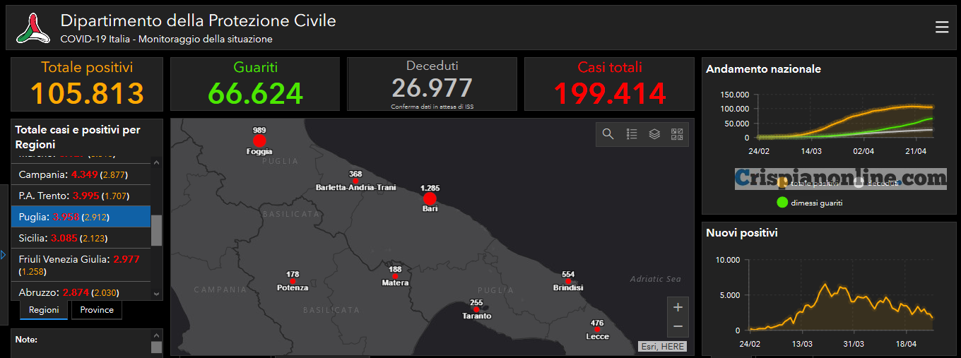 Il presidente della Regione Puglia, Michele Emiliano, sulla base delle informazioni del direttore del dipartimento Promozione della Salute Vito Montanaro, informa che oggi lunedì 27 aprile in Puglia, sono stati registrati 984 test per l’infezione da Covid-19 coronavirus e sono risultati positivi 10 casi, così suddivisi: