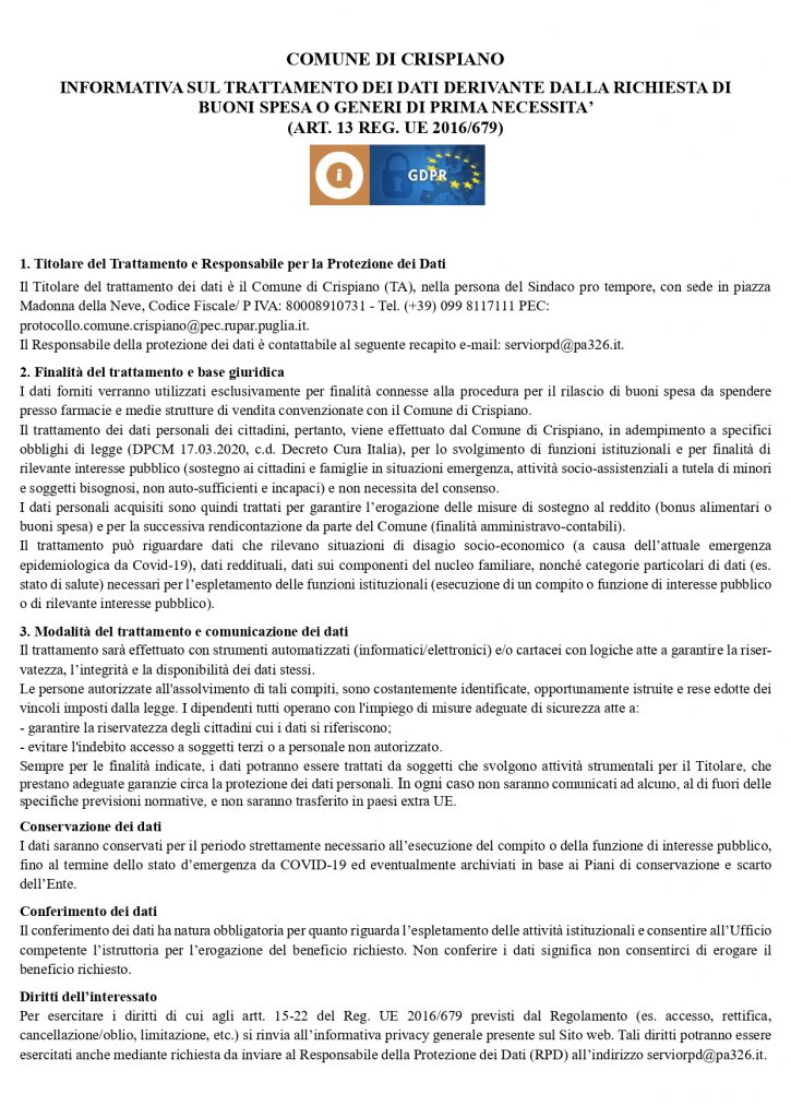 ⚠️ 𝗘𝗠𝗘𝗥𝗚𝗘𝗡𝗭𝗔 𝗖𝗢𝗩𝗜𝗗-𝟭𝟵 ⚠️‼️ 𝗩𝗜𝗗𝗘𝗢 𝗔𝗚𝗚𝗜𝗢𝗥𝗡𝗔𝗠𝗘𝗡𝗧𝗢 𝗦𝗨𝗟 𝗕𝗨𝗢𝗡𝗢 𝗦𝗣𝗘𝗦𝗔‼️👉 Guardate il video con attenzione per avere informazioni sulle modalità di erogazione del BUONO SPESA.👉Qui il link al Sito Comunale per scaricare il modulo per la domanda e l'avviso con i criteri:http://www.comune.crispiano.ta.it/index.php/elenco-news/760-avviso-pubblico-per-concessione-buoni-spesa-emergenza-coronavirus-covid-19👉 Utilizzate i commenti sotto questo post per chiedere chiarimenti e cercheremo di dare tutte le delucidazioni possibili, fermo restando che le pratiche relative alle vostre richieste verrano gestite dall’Ufficio Servizi Sociali.👉 Confido nell’elevato senso civico dei crispianesi:🔹il Buono Spesa è riservato a chi non ha oggi la possibilità di fare la spesa🔹chiedere il Buono Spesa senza averne bisogno vuol dire togliere il pane dalla bocca a chi si trova in emergenza alimentare e non può mangiare.👉 INFORMAZIONI L’Ufficio Servizi Sociali risponderà al numero ☎️ 𝟬𝟵𝟵-𝟴𝟭𝟭𝟳𝟮𝟮𝟳 ☎️ lunedì 6 e martedì 7 aprile, dalle ore 9:00 alle ore 13:00.