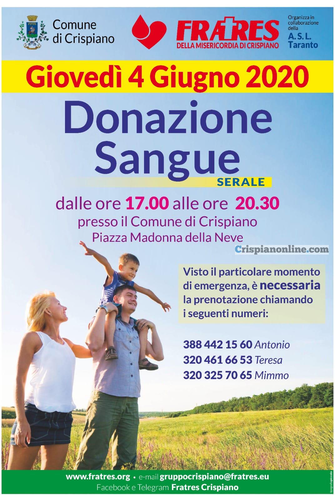 La Fratres di Crispiano informa che; insieme all’equipe della ASL di Taranto sta organizzando per giovedì 04 giugno 2020, dalle 17.00 alle 20.30, una Raccolta di Donazioni di Sangue, e che l’Autoemoteca sosterà in Piazza Madonna della Neve nei pressi del Comune di Crispiano.