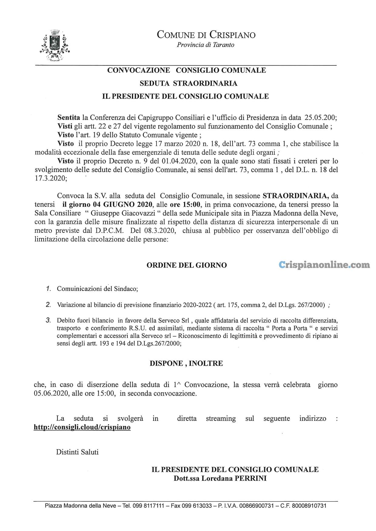Convocazione Consiglio Comunale, in sessione STRAORDINARIA, da tenersi il giorno 04 GIUGNO 2020, alle ore 15:00, in prima convocazione, da tenersi presso la Sala Consiliare ” Giuseppe Giacovazzi ” della sede Municipale sita in Piazza Madonna della Neve, con la garanzia delle misure finalizzate al rispetto della distanza di sicurezza interpersonale di un metro previste dal D.P.C.M. Del 08.3.2020, chiusa al pubblico per osservanza dell’obbligo di limitazione della circolazione delle persone:
