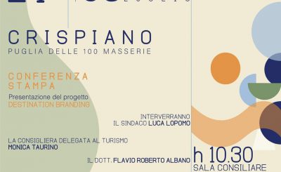 Martedì 6 luglio 2021 alle 10.30 nella Sala Consiliare del Comune di Crispiano, il Sindaco Luca Lopomo e il Consigliere Delegato al Turismo Monica Taurino presenteranno il progetto di Destination Branding dedicato alla città di Crispiano che l’amministrazione ha promosso insieme alle Masserie più attive e rappresentative del territorio in…