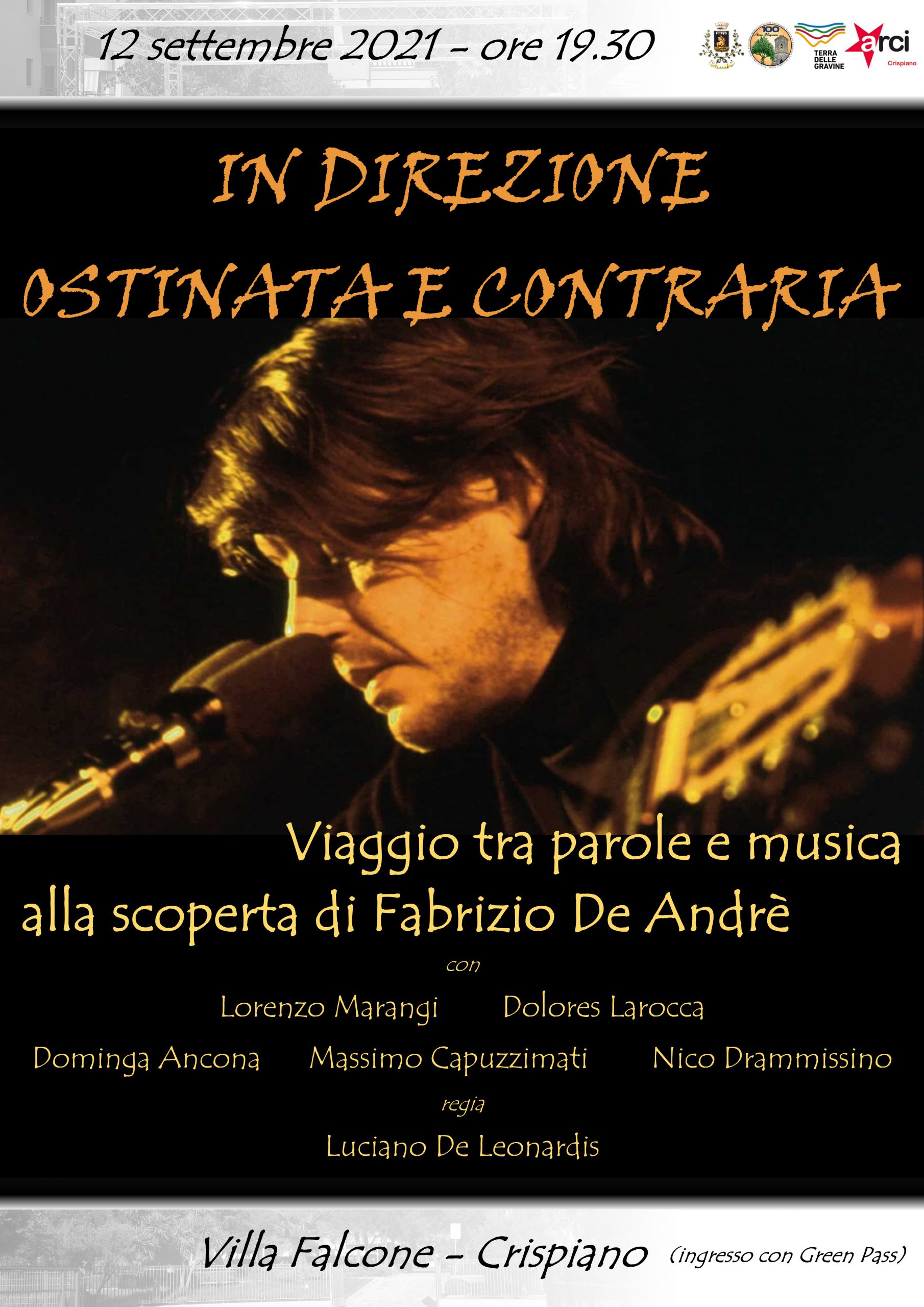 Per gli appassionati di Fabrizio De Andrè, domenica 12 settembre 2021, alle ore 19.30, presso la Villa Falcone di Crispiano verrà proposto un racconto del cantautore genovese attraverso la rilettura di alcuni suoi brani.