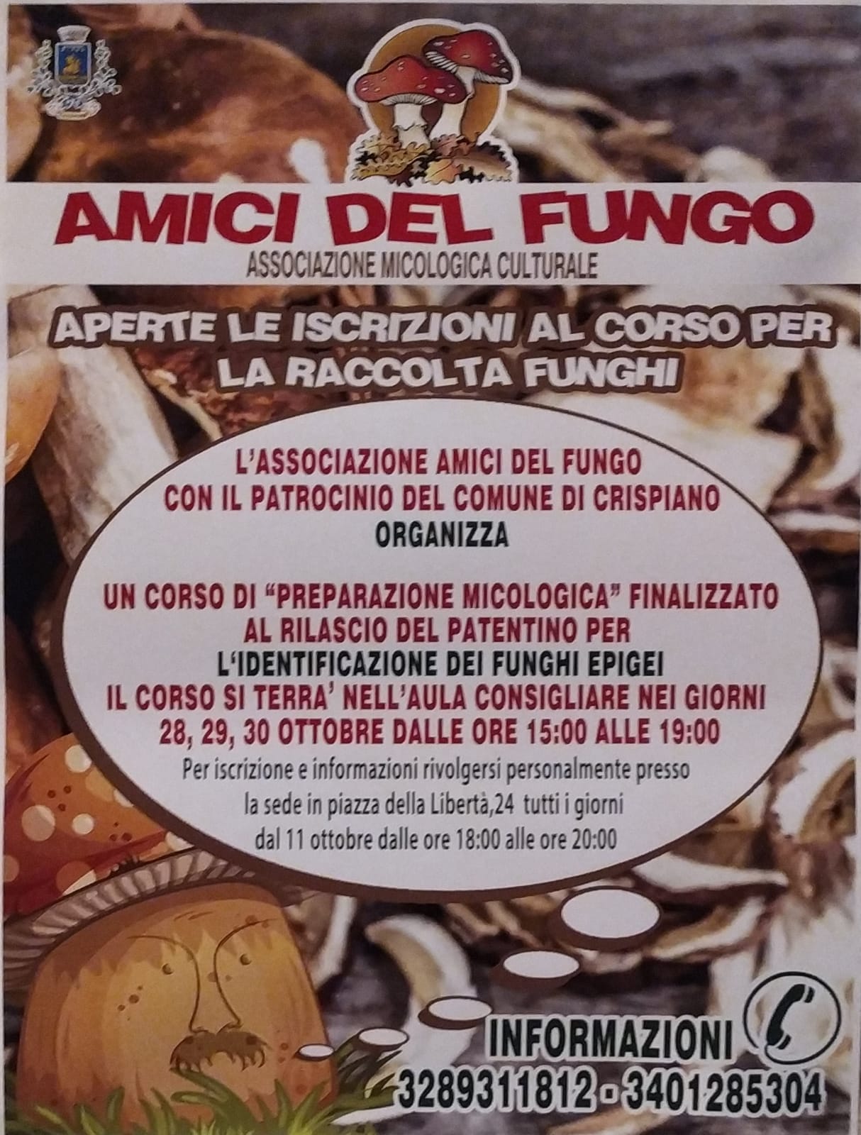 Arrivata la pioggia, si intensifica la raccolta dei funghi da parte di esperti, ma anche di “intenditori” improvvisati che mettono in pericolo la propria vita e  quella degli altri. Spesso la cronaca si occupa di tragedie famigliari dovuta proprio al consumo di funghi non commestibili. Non solo, la raccolta incontrollata danneggia il ciclo di produzione dei miceti e il loro ambiente naturale. Opportuna quindi l’iniziativa dell’Associazione Amici del Fungo, diretta da Lino Bruno, di organizzare, con il patrocinio del Comune di Crispiano, un Corso di “Preparazione micologica” finalizzato al rilascio del patentino per l’identificazione dei funghi epigei, ma anche obbligatorio per “andare a funghi”.