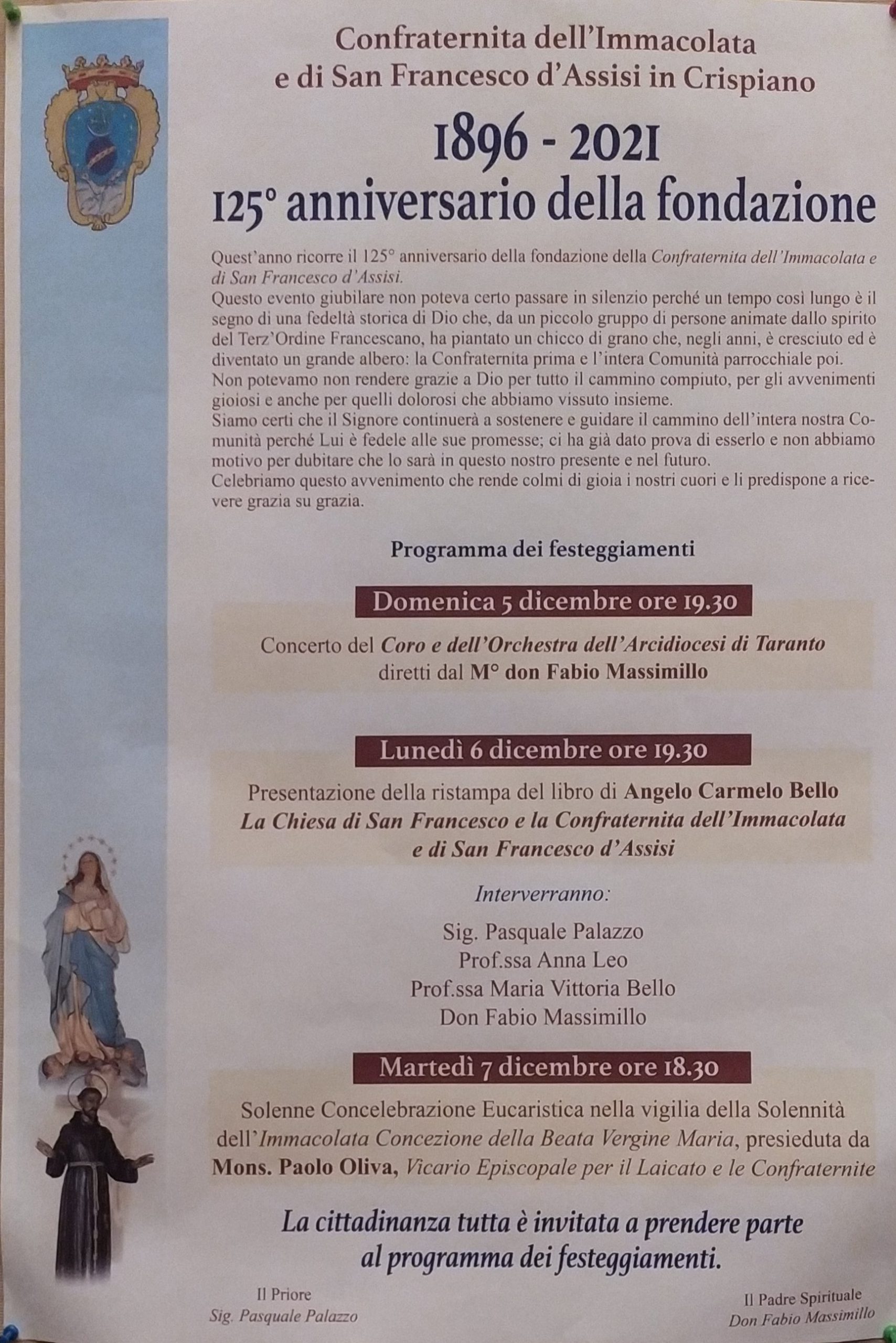 Confraternita dell’Immacolata e di San Francesco d’Assisi in Crispiano 1890 – 2021 125° anniversario della fondazione