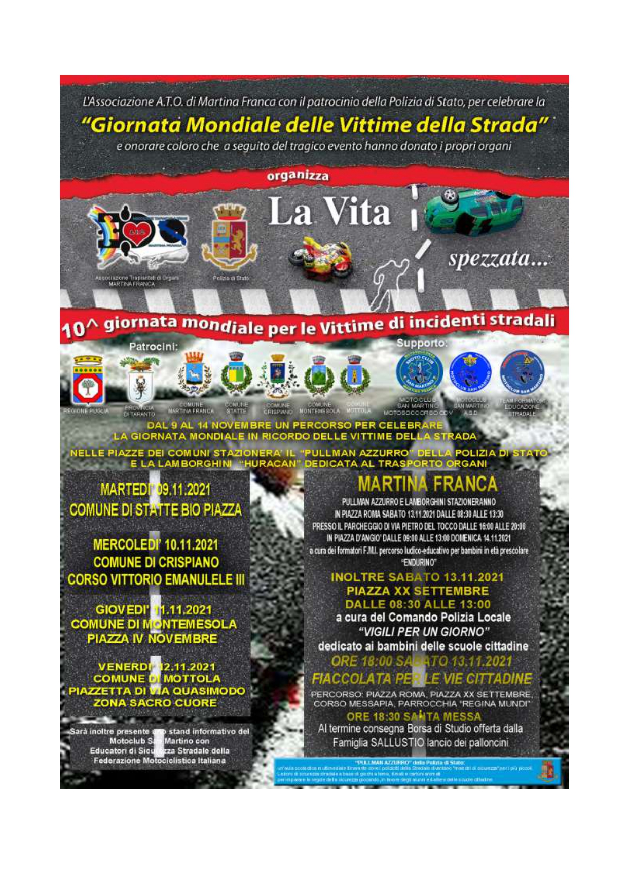 Sabato 13.11.2021 alle 18:00 a Martina Franca un corteo di motociclette, seguito dalle associazioni, dalle