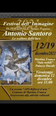 Antonio Santoro, scultore del Movimento Arcaista ha iniziato la sua “carriera” artistica nella Biblioteca comunale di Crispiano, dove da bambino ha frequentato un corso di pittura e successivamente ha partecipato a collettive e personali, organizzate dalla stessa Biblioteca. Santoro, “lo scultore della luce” ha partecipato alla biennale di Spoleto, curata dal maestro Giuliano Ottaviani con il quale, al termine, c’è stato uno scambio di opere. Come ospite d’onore è stato invitato a Fasano, alla 51° Mostra Fasanese dell’Artigianato. Nel 2014 ha avuto l’onore di incontrare Papa Francesco, al quale ha consegnato direttamente l’opera “Tasselli di Taranto”. Nel 2019 il presidente dell’Associazione Riflessi d’arte, Tonio Cantore, a nome del direttivo associativo, ha donato alla fondazione Paolo Grassi di Martina Franca, presieduta dal prof. Franco Punzi, l’opera “I quattro elementi”, realizzata dal maestro scultore di Crispiano, commissionata dall’associazione “Riflessi d’arte” per celebrare i 500 anni dalla morte di Leonardo da Vinci. Tanti i riconoscimenti ricevuti in Italia e all’estero tra i quali il titolo di “Maestro d’Arte e delle Arti Visive (Università del Salento)”, poi il primo posto assoluto “Avanguardi e Artistiche 2011” a Parigi, nello stesso anno il “Leone d’Oro” di Venezia per l’arte e al 4° premio internazionale arcaista (primo posto assoluto di pittura e scultura). Con riferimento alla sua opera, con la quale partecipa al Festival di Martina, “Sumus Pegasus” Santoro dichiara: “Mai come in questi tempi ci deve essere una voglia di volare con la forza e la fierezza di un mustang”. In questo evento, che si concluderà il 19 prossimo, lo scultore di Crispiano sarà insignito del titolo di Rettore Accademico e Cavaliere dell’Arte. Il nuovo impegno di Santoro è l’apertura a Crispiano di una Accademia nella quale saranno impegnati come docenti, lo stesso Santoro insieme a Rosita Achille e a Francesco D’Elia pittore.