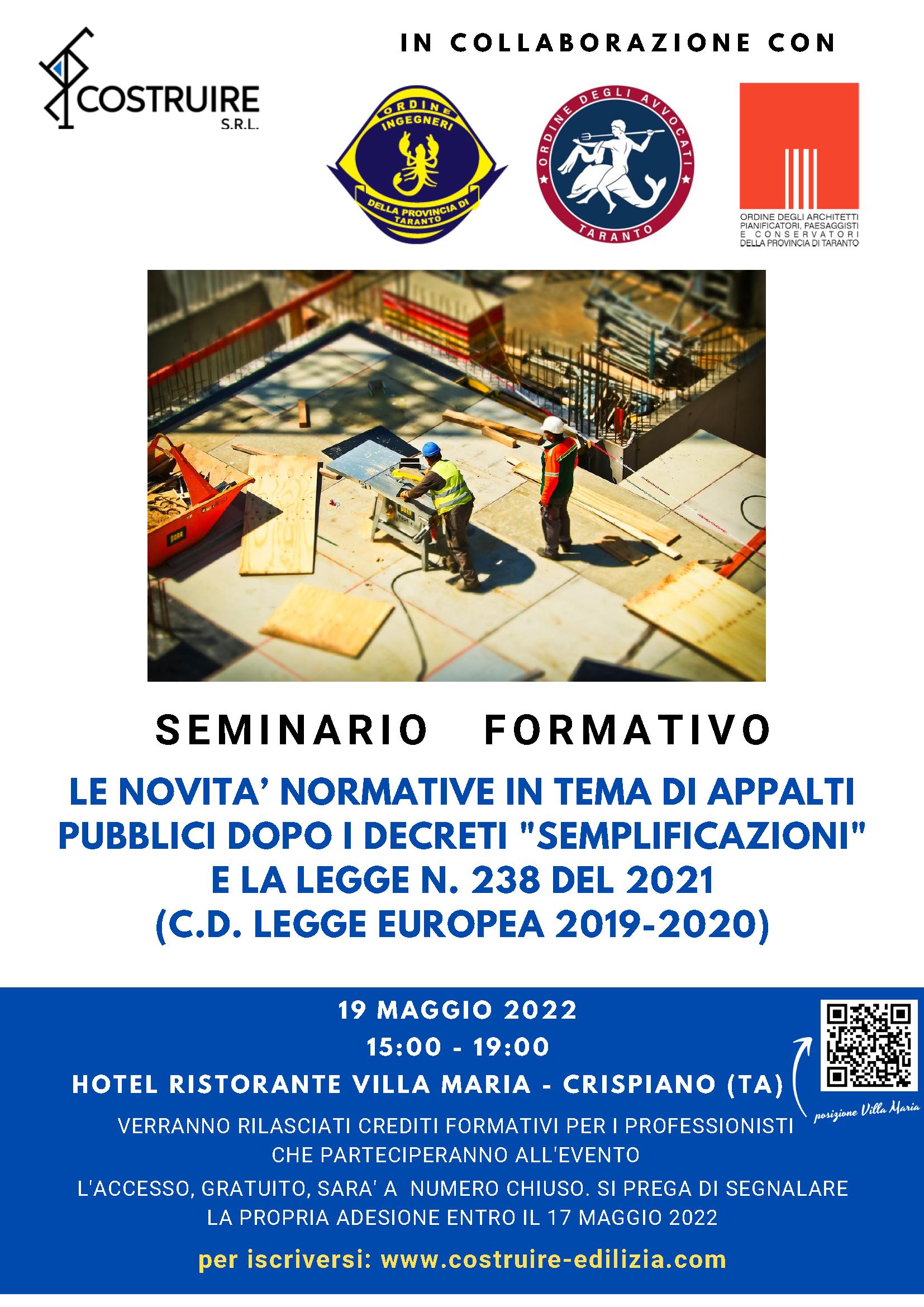 Giovedì 19 maggio, dalle ore 15,00 alle ore 19,00, si terrà, presso l’Hotel Ristorante Villa Maria a Crispiano (TA), un importante seminario dal titolo “Le Novità Normative in Tema di Appalti Pubblici dopo i Decreti “Semplificazioni” e la legge n. 238 del 2021 (c.d. Legge Europea 2019-2020)” organizzato dalla Costruire Srl, società edile della Provincia di Taranto, in collaborazione con gli Ordini provinciali degli Ingegneri, Architetti ed Avvocati, con rilascio di Crediti Formativi per i professionisti che vi parteciperanno.