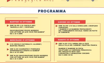 Continuano le attività della Carovana Pedagogica del Progetto Rete CEET – Cultura, Educazione, Empowerment, Territorio, di cui Arci è capofila, un progetto selezionato da Con i Bambini nell’ambito del Fondo per il contrasto della povertà educativa minorile. Dopo l’arrivo a Martina Franca lo scorso 17 ottobre, la Carovana Pedagogica farà…