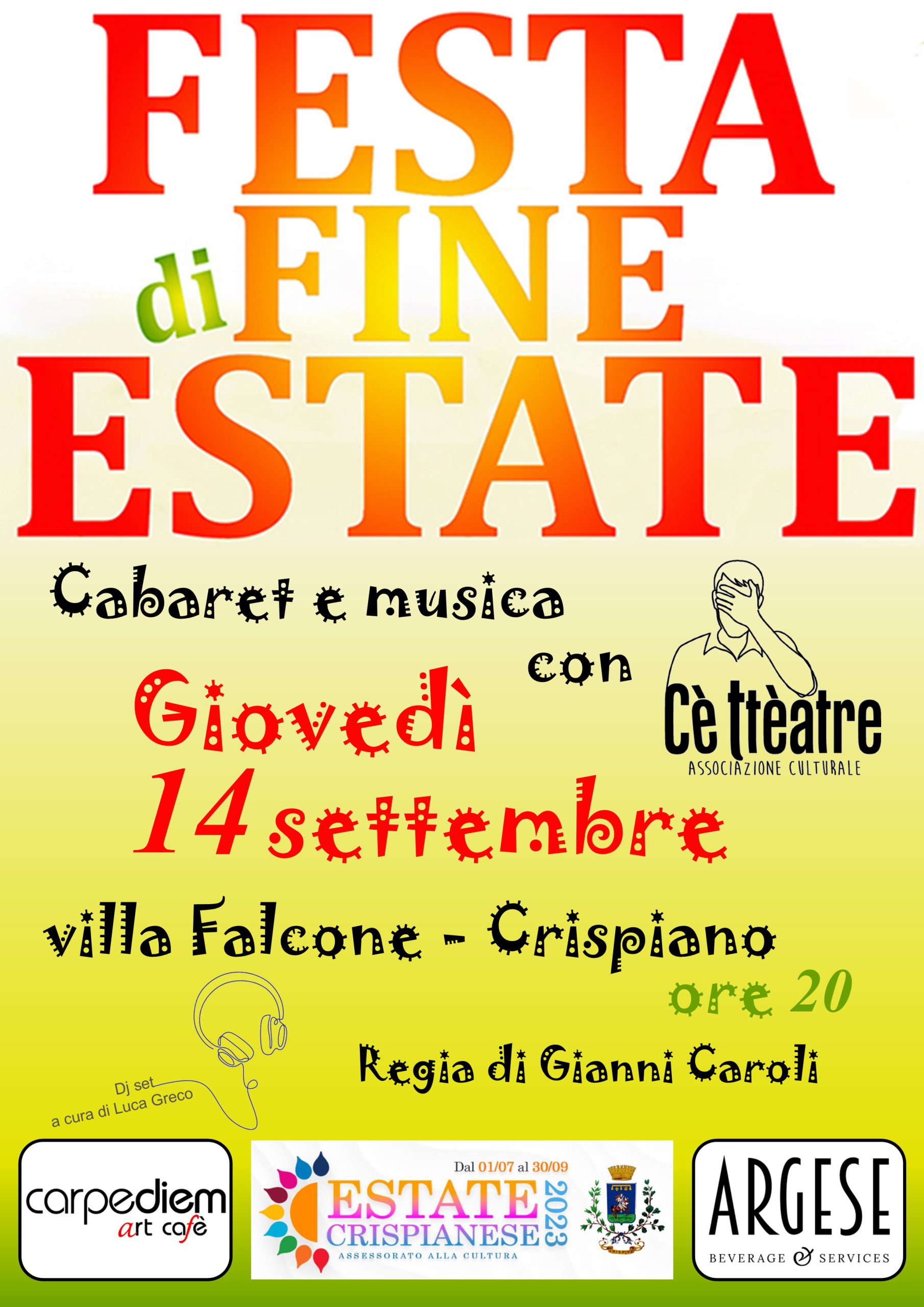 FESTA DI FINE ESTATE 12 Settembre 202312 Settembre 2023notizie / spettacolo L’addio alla bella stagione, noi lo vogliamo dare a modo nostro, con cabaret e musica…Vi aspettiamo in villa Falcone, giovedì 14, per ridere insieme e, perché no, anche ballare.Non mancate…