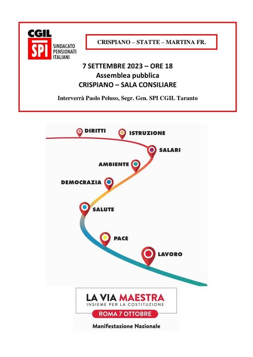 Per parlarne lo SPI Cgil di Crispiano con la lega di Statte e Martina Franca invita iscritti e cittadini a partecipare all’assemblea pubblica il 7 settembre alle ore 18 presso la Sala Consiliare del Comune di Crispiano.