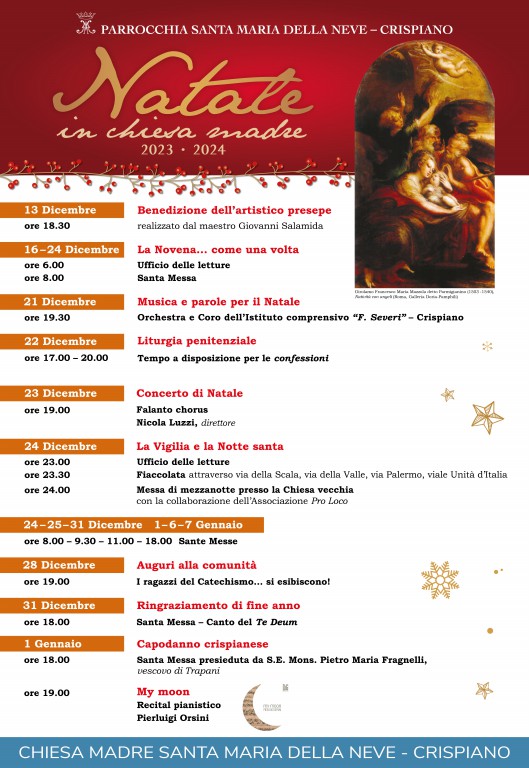 Ritorna puntuale anche quest’anno la rassegna del “Natale in Chiesa madre” promossa dalla Parrocchia Santa Maria della neve in Crispiano retta da don Michele Colucci. Si tratta di un ricco cartellone di eventi che spaziano dalla liturgia alla musica e abbracciano le tradizioni del periodo natalizio così care alla nostra gente. Oltre gli appuntamenti classici della novena al mattino presto e le celebrazioni liturgiche dei giorni delle festività natalizie, segnaliamo i concerti musicali programmati: il 21 dicembre quello dell’Istituto comprensivo “F. Severi” di Crispiano, il 23 dicembre il Concerto di natale affidato quest’anno al “Falanto chorus” di Taranto diretto dal maestro Nicola Luzzi e il 1 gennaio il recital pianistico del maestro Pierluigi Orsini, valente pianista di Palagiano che ha recentemente pubblicato il cd “My moon” (etichetta Digressione). Tutti i concerti si tengono a Crispiano in Chiesa madre alle ore 19,30 con ingresso libero.