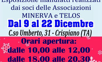 In collaborazione del Centro Servizi Volontariato di Taranto e con il patrocinio del Comune di Crispiano, i soci delle Associazioni “Minerva Università del Tempo Libero e del Sapere” e “Telos” esporranno in C.so Umberto, 31 a Crispiano (TA), dal 09 al 22 dicembre, le proprie creazioni fatte a mano e…