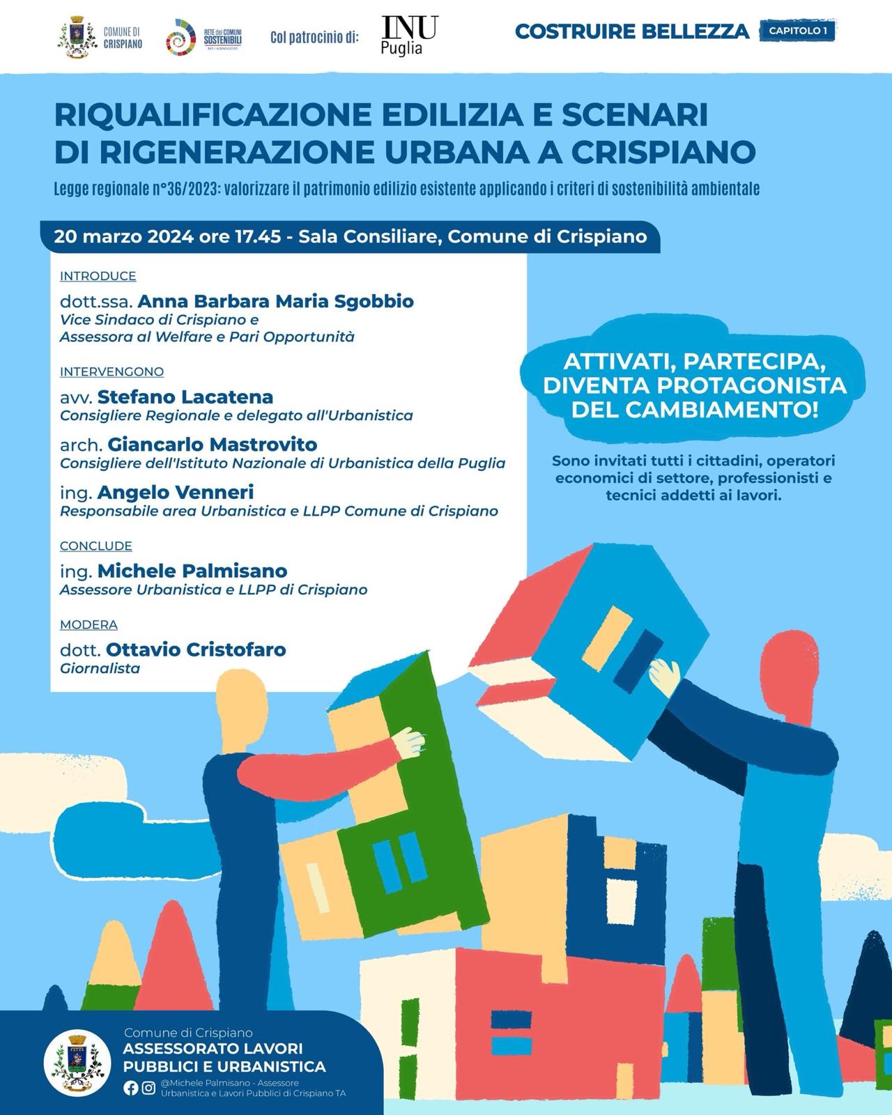 “Riqualificazione edilizia e scenari di rigenerazione urbana a Crispiano”, è questo il tema dell’incontro che si terrà mercoledì 20 marzo, alle ore 17:45 presso la sala consiliare del Comune. Il focus è sulla legge regionale n. 36/2023, riguardo la valorizzazione del patrimonio edilizio esistente applicando i criteri di sostenibilità ambientale.