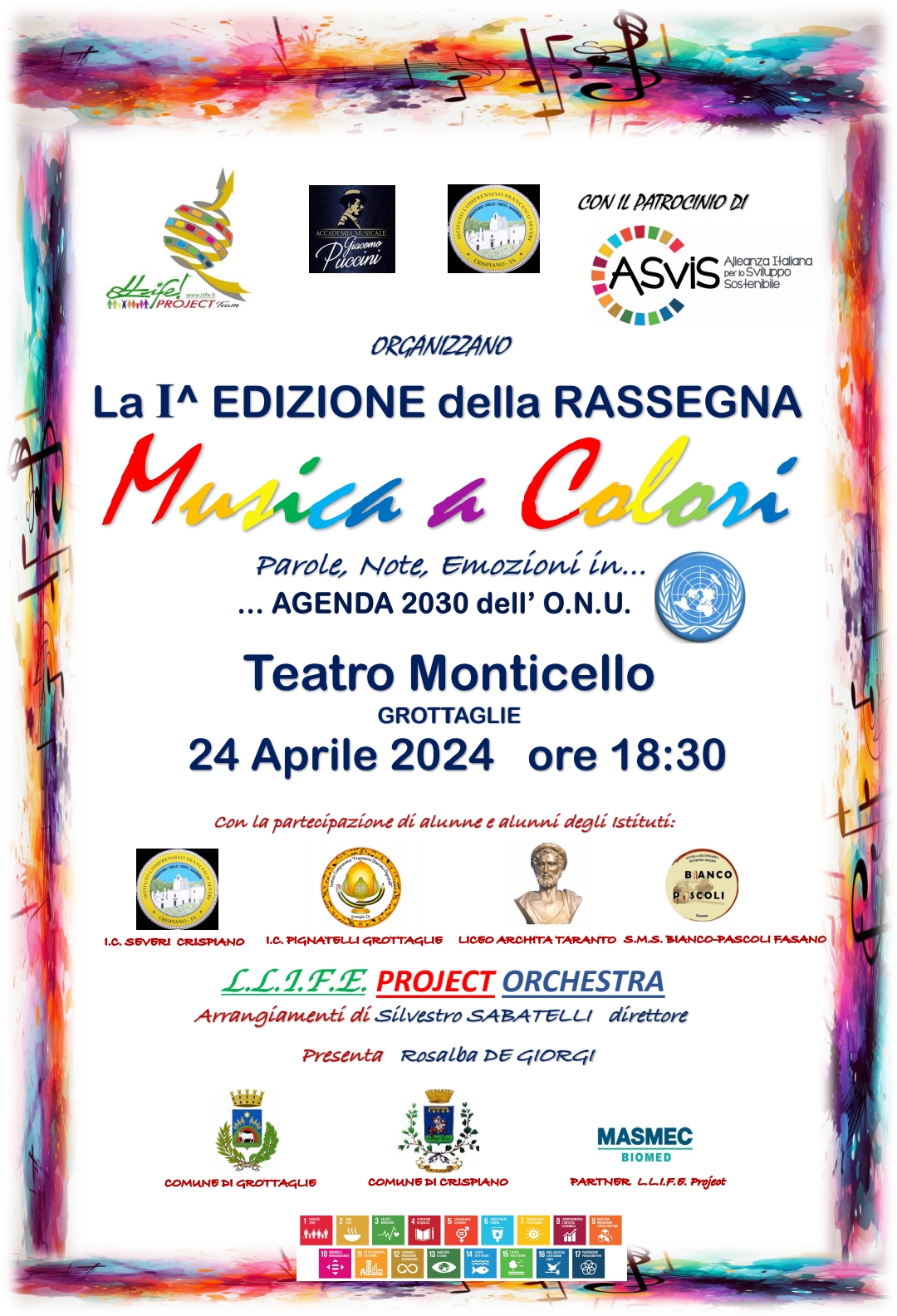 L’Accademia Musicale “Giacomo Puccini” e il L.L.I.F.E. Project Team in collaborazione con l’Istituto comprensivo “Francesco Severi” di Crispiano organizzano la I^ Rassegna “Musica a Colori”, che si svolgerà al Teatro Monticello di Grottaglie il 24 aprile prossimo. La Rassegna gode del patrocinio morale di ASviS (Alleanza Italiana per lo Sviluppo Sostenibile) e dei Comuni di Grottaglie e Crispiano.