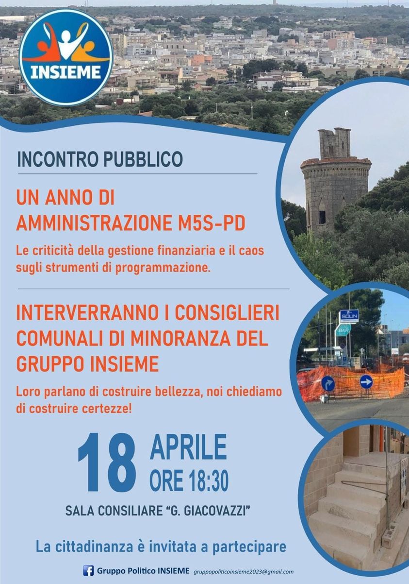 All’incontro in oggetto, interverranno i consiglieri Fortunato Costantino, Paolo Carone, Tommaso Chiarelli, Chiara Lodeserto e Arianna Luccarelli per illustrare sullo stato attuale di importanti argomenti di interesse amministrativo tra cui: informare la cittadinanza sia circa le criticità della gestione finanziaria alla luce delle richieste effettuate dalla Corte dei Conti all’attuale Amministrazione Lopomo 2 e sulle contraddittorie programmazioni per il redigendo piano urbanistico generale.