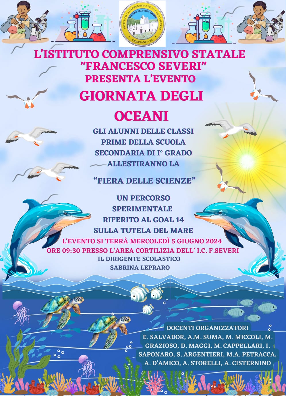 A seguire, il 5 giugno nell’area outdoor del plesso Severi si è svolta La Giornata degli Oceani, un percorso sperimentale attinente al Goal 14 Vita sott’acqua dell’Agenda 2030 dell’ONU sulla tutela del mare, tema conduttore scelto per l’anno scolastico 2023 / 2024. L’evento ha coinvolto gli alunni e le alunne delle classi prime della scuola secondaria di primo grado che hanno dato vita alla “Fiera delle Scienze” con esperimenti svolti in tempo reale e dettagliatamente descritti con appropriata terminologia scientifica, sotto lo sguardo ammirato dei genitori presenti. La Giornata degli Oceani è stata realizzata dal dipartimento di Matematica, Scienze e Tecnologia guidato dalla professoressa Anna Maria Suma e composto dai docenti Santa, Argentieri, Marianna Cappellari, Martino Grazioso, Maria Miccoli, Maria Antonietta Petracca, Elisa Salvador, Ilaria Saponaro, Andrea D’Amico e Domenico Maggi. Alla realizzazione dell’evento ha collaborato il Dipartimento Altri Linguaggi con suggestive coreografie sul tema del mare ideate dai docenti di Scienze Motorie Angelo Cisternino, Angela Storelli, realizzate sulle musiche eseguite dall’orchestra Severi.