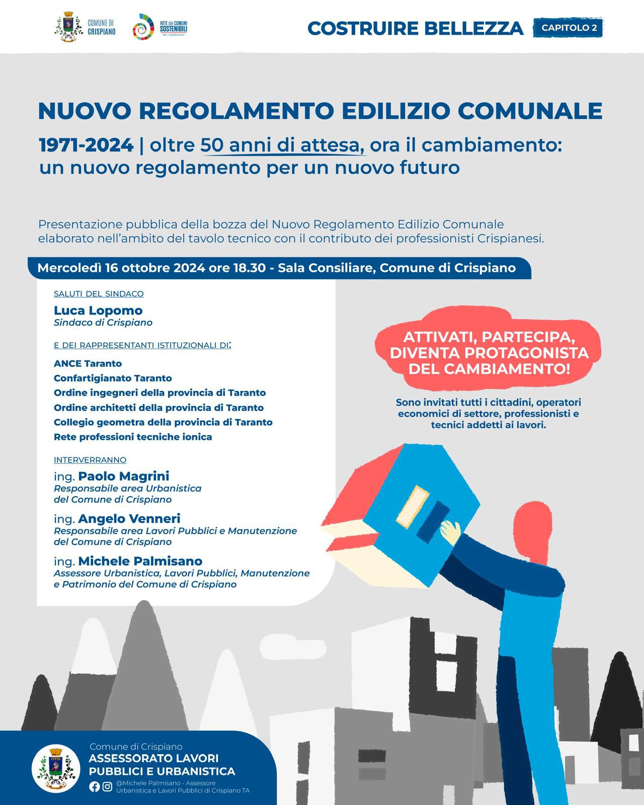 Il Comune di Crispiano invita tutti i cittadini, i tecnici e gli operatori del settore a partecipare alla presentazione della bozza del Nuovo Regolamento Edilizio Comunale, che si terrà mercoledì 16 ottobre alle ore 18:30 presso la sala consiliare.