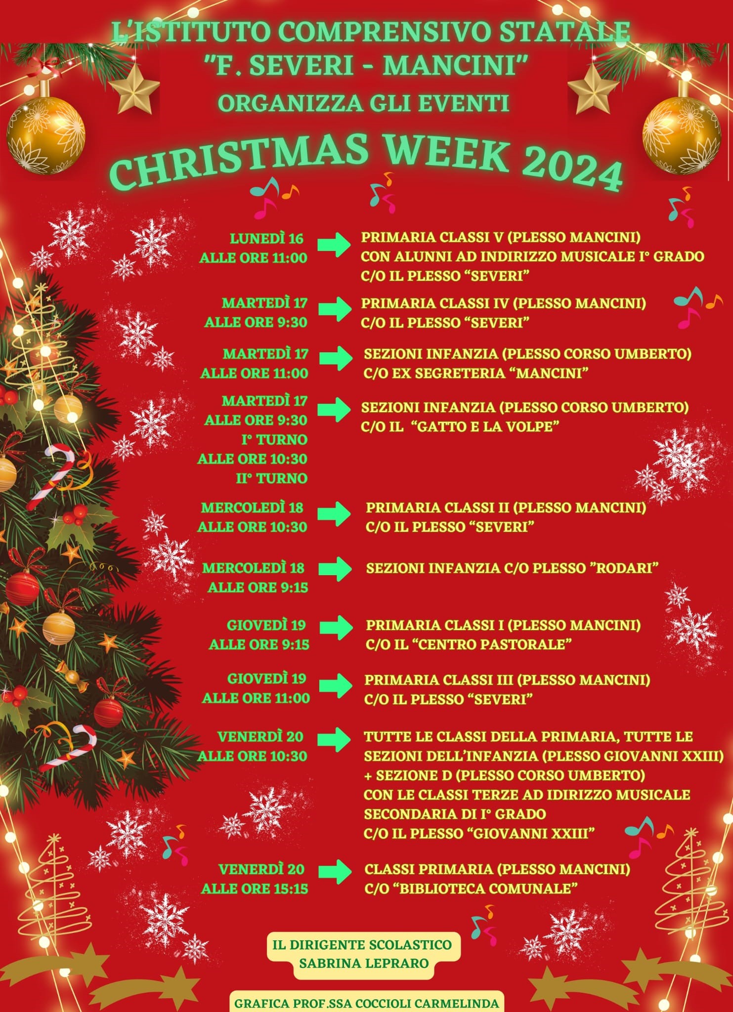 È stata una intensa Christmas week quella che dal 16 al 20 Dicembre 2024 ha visto protagonisti i tre ordini di scuola dell’istituto comprensivo “F. Severi-Mancini”, caratterizzata da un calendario di eventi natalizi ricco e variegato in cui alunni e alunne, dai più piccoli della scuola dell’infanzia ai più grandi della scuola secondaria di primo grado, hanno rivolto gli Auguri di Buon Natale alla comunità con canti, filastrocche, poesie. Aria di festa e di allegria, ma anche momenti riflessione sulla Pace, in linea con il tema conduttore scelto per l’anno scolastico 2024/2025, ovvero, il Goal 16 dell’Agenda 2030 Pace, Giustizia e Istituzioni forti, hanno scandito ogni giorno dell’ultima settimana di scuola, prima della pausa per le festività natalizie. La complessa dislocazione temporanea delle diverse sezioni e classi della scuola dell’infanzia e primaria dell’ex circolo didattico Mancini, non ha impedito la realizzazione di iniziative volte a celebrare l’attesa del Natale con alunni, insegnanti, famiglie alla presenza del dirigente scolastico, dei rappresentanti del consiglio di istituto e delle istituzioni.