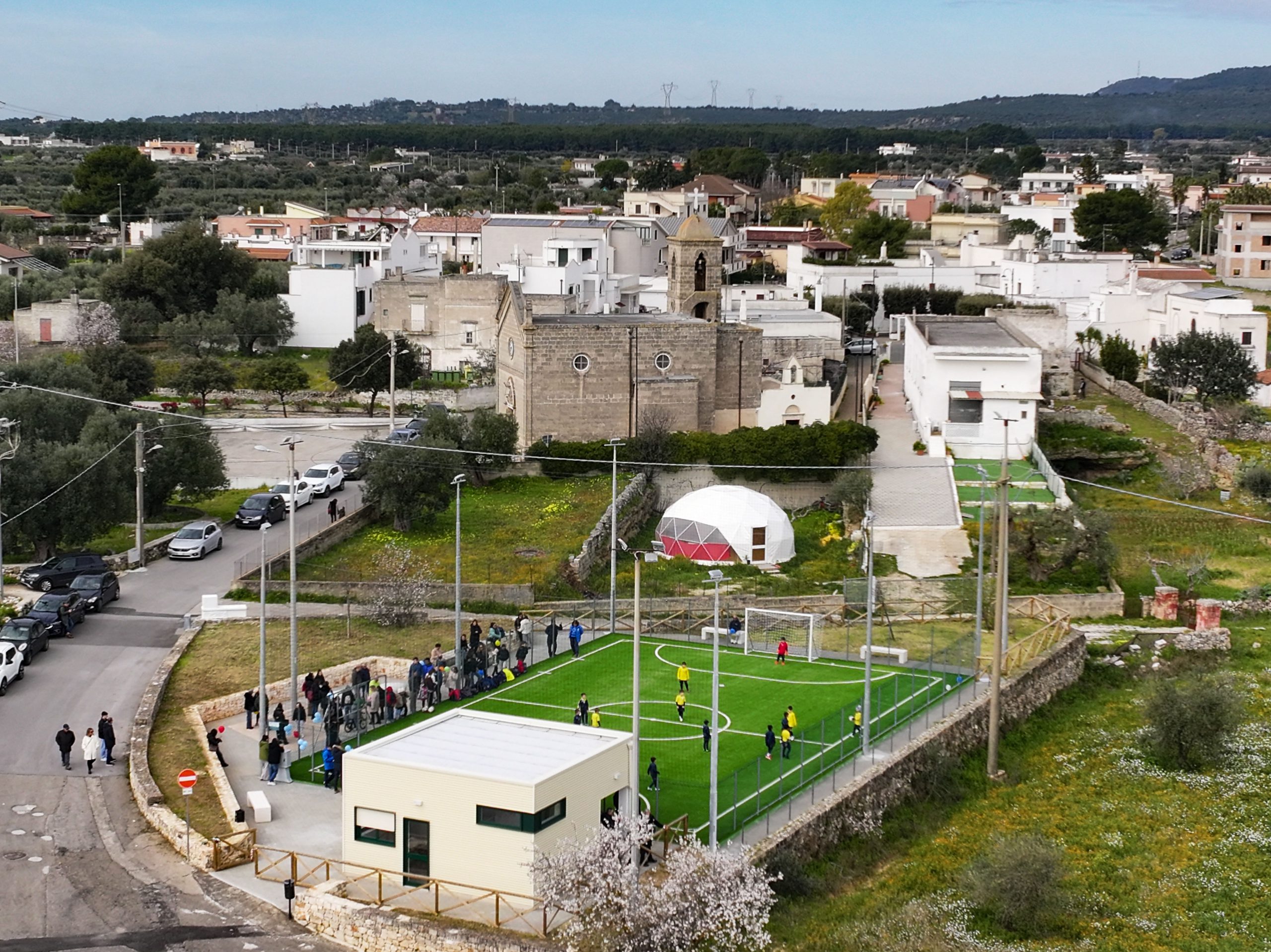 Crispiano è stata destinataria dell’intervento relativo al borgo di San Simone, un quartiere periferico che però rappresenta un luogo identitario per l’intera comunità. L’intervento ha previsto la realizzazione di un campo di calcetto in erba sintetica, un edificio con spogliatoio e servizi, e la riqualificazione dell’area circostante.