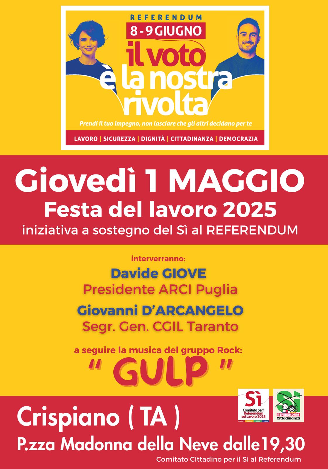 Lo celebreremo con la musica del gruppo Rock “Gulp” e di un gruppo di giovani musicisti crispianesi “ The Travel” ma anche con alcuni momenti di riflessioni, tra cui la testimonianza di una lavoratrice che vive sulla propria pelle il dramma di un lavoro povero e precario.