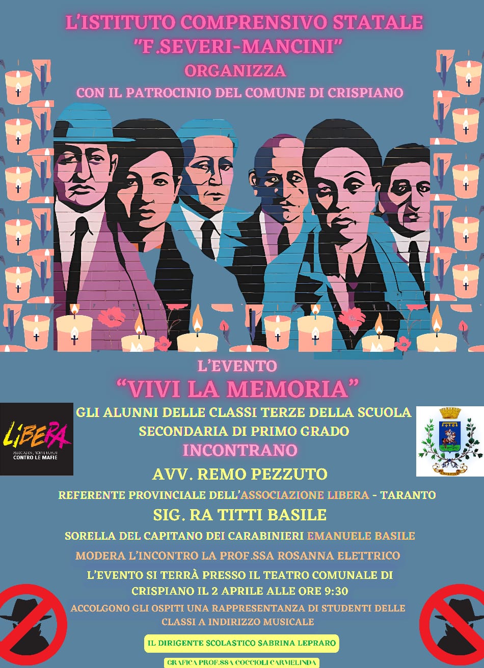 L’incontro dal titolo Vivi la Memoria promosso con il patrocinio del Comune di Crispiano, in collaborazione con Libera. Associazioni, nomi e numeri contro le mafie – associazione nazionale presieduta da don Luigi Ciotti –, si è svolto il 2 aprile scorso presso il Teatro Comunale alla presenza dell’avvocato Remo Pezzuto, referente di Libera sezione di Taranto, della signora Titti Basile, sorella del Capitano dell’Arma dei Carabinieri Emanuele Basile vittima di mafia, della dirigente scolastica dott.ssa Sabrina Lepraro, del sindaco Luca Lopomo e di una rappresentanza dell’Arma dei Carabinieri composta fra gli altri dal capitano Antonino Bruno Lanza della Compagnia dei Carabinieri di Massafra e dal luogotenente Paolo Fago comandante della Stazione Carabinieri di Crispiano.