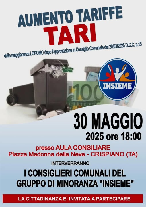 Venerdì 30 Maggio alle ore 18.30 presso la sala consiliare del Comune di Crispiano il gruppo politico INSIEME incontra la cittadinanza per parlare degli aumenti TARI.