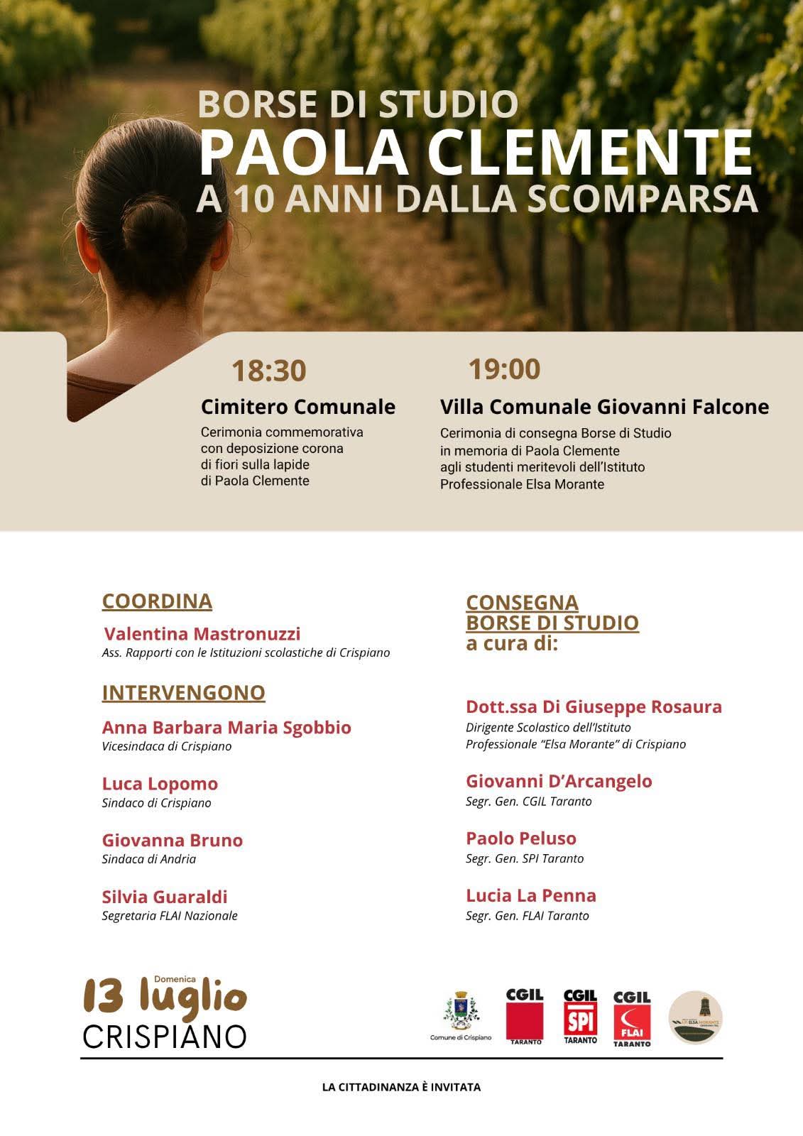 La comunità di Crispiano si appresta a vivere un momento di profonda riflessione e celebrazione, ricordando Paola Clemente a dieci anni dalla sua tragica scomparsa. Paola, lavoratrice agricola, è stata una vittima di fatica e caporalato, e il suo ricordo è più che mai vivo nel cuore della comunità. Per onorare la sua memoria e, al contempo, celebrare l’impegno e il merito scolastico, è stata organizzata una cerimonia commemorativa e la consegna delle borse di studio a lei intitolate.