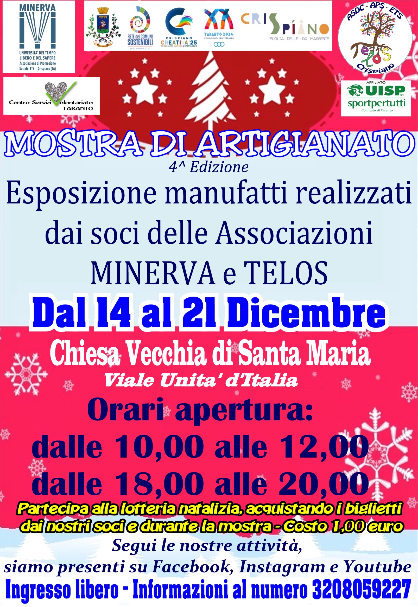 Dal 14 AL 21 DICEMBRE, sarà allestita, all’interno della Chiesa Vecchia S. Maria sita in viale Unità d’Italia, la 4^ edizione della Mostra di Artigianato locale che vedrà esposte le opere creative prodotte dai soci dell’ Associazione S.D.C. Telos e dell’associazione Minerva, settore Università del Tempo Libero e del Sapere.