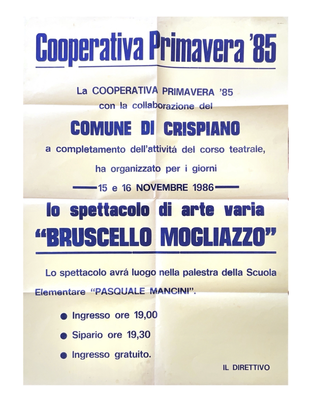 Di questo percorso artistico di Gustavo siamo riusciti a restaurare un video inedito (per il quale ringraziamo Andrea Magli) dello spettacolo “Bruscello Mogliazzo”, diretto da Gustavo e andato in scena a Crispiano nel 1986. È un piacere e un’emozione poter presentare questo video in memoria di Gustavo, ad un anno dalla sua scomparsa, nel quale è possibile ritrovare anche i volti di tante  persone amiche che gli hanno voluto bene e hanno partecipato agli spettacoli da lui organizzati. Potete visionare questo video inedito cliccando sul seguente link YouTube: https://youtu.be/gMPuCClfQao