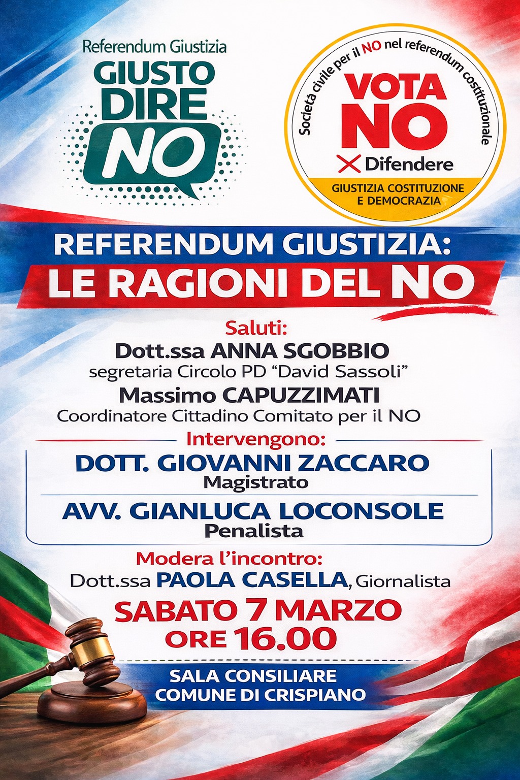 Organizzata dal Comitato Cittadino per il NO di Crispiano è in programma per Sabato 7 marzo alle ore 16,00 presso la Sala Consiliare del Comune di Crispiano un incontro su Referendum Giustizia “LE RAGIONI DEL NO”