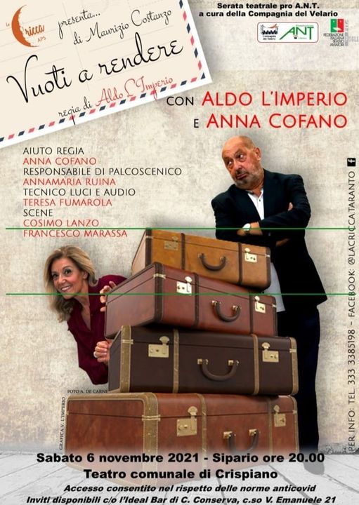 Dopo circa due anni di sacrifici e sofferenza, torna in teatro ‘la Compagnia del Velario’, che ha organizzato uno spettacolo con l’esibizione della pluripremiata compagnia la ‘Cricca’ di Taranto. L’incasso della serata sarà devoluto all’ ANT di Crispiano, che si occupa dell’assistenza domiciliare agli ammalati oncologici. L’appuntamento è per sabato 6 novembre – teatro Comunale di Crispiano – entrata a partire dalle ore 20,00. Sipario ore 20,30. Inviti da ritirare presso Ideal bar di Claudio Conserva.