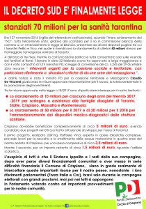 RICEVIAMO E PUBBLICIAMO Era il 27 novembre 2016 (vigilia del referendum costituzionale), quando l’intero schieramento del “NO”, tutto felicemente unito, gridava allo scandalo per il no in commissione bilancio della camera su un emendamento in legge di bilancio, presentato da diversi deputati pugliesi tra cui i tarantini Pelillo e Vico, nel quale si rivendicava lo stanziamento di ulteriori 50 milioni di euro per fronteggiare l’emergenza sanitaria di Taranto. A distanza di tre mesi, mentre la comunicazione politica è tutta concentrata solo sulle vicende dei familiari di Renzi, il Senato in data 22 febbraio scorso ha approvato a larga maggioranza e con il volto compatto di tutti i senatori PD, la legge di conversione del d.l. n.243 del 29 dicembre 2016 recante “ interventi urgenti per la coesione sociale e territoriale, con particolare riferimento a situazioni critiche di alcune aree del mezzogiorno ”. A darne notizia è stato il ministro PD per la coesione territoriale e Mezzogiorno Claudio De Vincenti giudicando le misure approvate importantissime per il lavoro, la tutela ambientale e la promozione degli investimenti. Tra le misure approvate nella legge n.18/2017 sono di particolare interesse per il nostro territorio : – Lo stanziamento di 10 milioni per ciascuno degli anni del triennio 2017-2019 per sostegno e assistenza alle famiglie disagiate di Taranto, Statte, Crispiano, Massafra e Montemesola; – Lo stanziamento di 50 milioni per il 2017 e di 20 milioni per il 2018 per l’ammodernamento dei dispositivi medico-diagnostici delle strutture sanitarie. Crispiano dovrebbe beneficiare complessivamente di circa 5 milioni di euro, avendo candidato due progetti nel CIS (contratto istituzionale di sviluppo per l’area di Taranto). Il primo progetto, realizzato dall’Ing. Raffaele Vinci, esperto in opere idrauliche complesse, prevede lavori per la raccolta e lo smaltimento delle acque meteoriche in quattro aree del centro abitato di Crispiano, per una spesa complessiva di circa 3,5 milioni di euro. Mentre il secondo, per un importo restante di circa 1,5 milioni di euro, riguarda l’edilizia scolastica. L’auspicio di tutti è che il Sindaco Ippolito e i resti della sua compagine, dopo aver perso diversi finanziamenti comunitari e aver messo in serie difficoltà finanziarie il Comune di Crispiano, siano in grado realmente di intercettare queste importanti risorse per il nostro paese, nonostante i loro riferimenti parlamentari (Forza Italia e Cor), bravi solo durante le campagne elettorali con grandi proclami, mai poi nei fatti si oppongono in Parlamento votando contro ad importanti provvedimenti per le nostre comunità. Coordinamento cittadino Partito Democratico di Crispiano