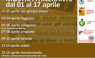 Taranto e la sua provincia, su iniziativa dell’associazione “Le città che vogliamo”, dell’Ufficio Scolastico Provinciale e del Comitato Qualità della Vita, sono state inserite anche quest’anno tra le sei tappe italiane della mostra, realizzata e promossa dalla Fondazione Museo Della Shoah – Onlus, con il Patrocinio della Presidenza del Consiglio…