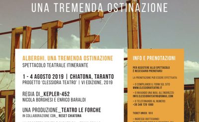 “E se vai all’Hotel Supramonte e guardi il cielo tu vedrai una donna in fiamme e un uomo solo e una lettera vera di notte falsa di giorno e poi scuse, e accuse e scuse, senza ritorno” Dal 1° al 4 Agosto 2019, ritorna a Chiatona (TA) il progetto “Clessidra”…