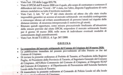 http://www.comune.crispiano.ta.it/images/doc00247420200310151324.pdf IL SINDACO INFORMA LA CITTADINANZA CHE: Occorre evitare ogni spostamento di persone in entrata e in uscita dal territorio comunale, nonché all’interno del medesimo territorio, salvo che gli spostamenti siano comprovati da esigenze lavorative o situazioni di necessita’ o per motivi di salute. E’ assolutamente vietato allontanarsi dalla propria…