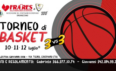 In occasione del centenario del Comune di Crispiano, la Fratres organizza un TORNEO DI BASKET 3vs3 🏀🏀🏀🏀🏀🏀 Il torneo si svolgerà nella Palestra Giovanni XXIII a Crispiano il 10-11-12 Luglio (in base al proprio girone una squadra giocherà o il 10 o l’11 e il 12 se si qualifica alle…