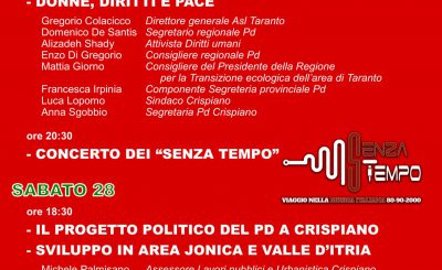 ll Circolo del Partito Democratico di Crispiano è lieto di annunciare il ritorno, dopo diversi anni, della Festa dell’Unità, che si terrà venerdì 27 e sabato 28 settembre nella suggestiva cornice di Villa Falcone-Borsellino, a partire dalle 18,30. Un appuntamento che rappresenta un momento di incontro e riflessione sulla nostra…