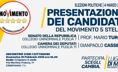 Domenica 18 febbraio alle ore 10.30 il MoVimento 5 Stelle presenta a Crispiano, presso la sede del meetup Crispiano 5 Stelle, i candidati nei collegi uninominali di Senato e Camera, Gianpaolo Cassese e Mario Turco. Un’occasione per conoscerli, ascoltarli ed informarsi sul programma per governare l’Italia. #PartecipaScegliCambia con #GianpaoloCassese #MarioTurco…