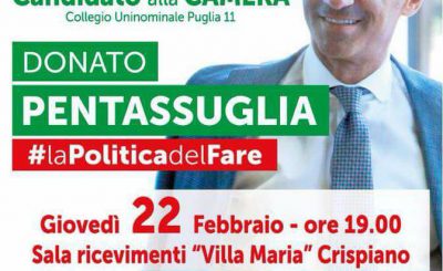 Giovedì 22 Febbraio 2018 ore 19.00 sala ricevimenti “Villa Maria” Crispiano (Ta) presentazione del candidato alla camera collegio uninominale Puglia 11 Donato Pentassuglia