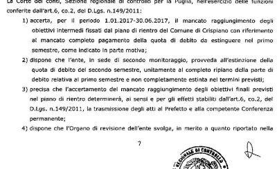 Riceviamo e pubblichiamo Sul primo monitoraggio semestrale (1.1.2017 – 30.6.2017) del Piano di rientro del Comune di Crispiano la Corte dei Conti con delibera del 23 ottobre 2017 (che pubblichiamo), ha dato esito negativo. In particolar modo per l’esposizione debitoria, la Corte dei Conti scrive che “l’obiettivo di ripiano previsto…